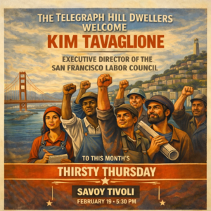 Join the Telegraph Hill Dwellers as we welcome Kim Tavaglione, Executive Director of the San Francisco Labor Council, will be at our monthly Thirsty Third Thursday at Savoy Tivoli, 1434 Grant Ave., at 5:30 PM on February 19th, 2026.